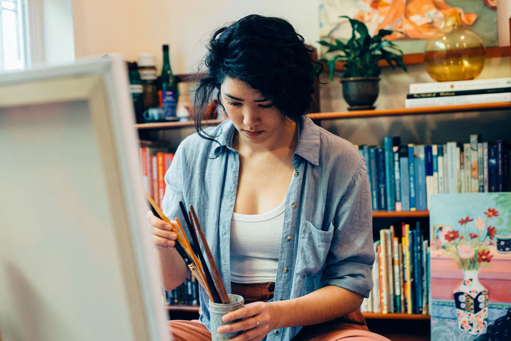 My artwork is inspired by my cultural heritage and the quiet intimacy of everyday moments. I grew up admiring the delicate details in the Japanese objects around my home, from paintings to pottery to textiles, and saw the care that went into creating them from the artists in my family. Playing with soft brushstrokes and color, I create calming scenes to welcome you home.